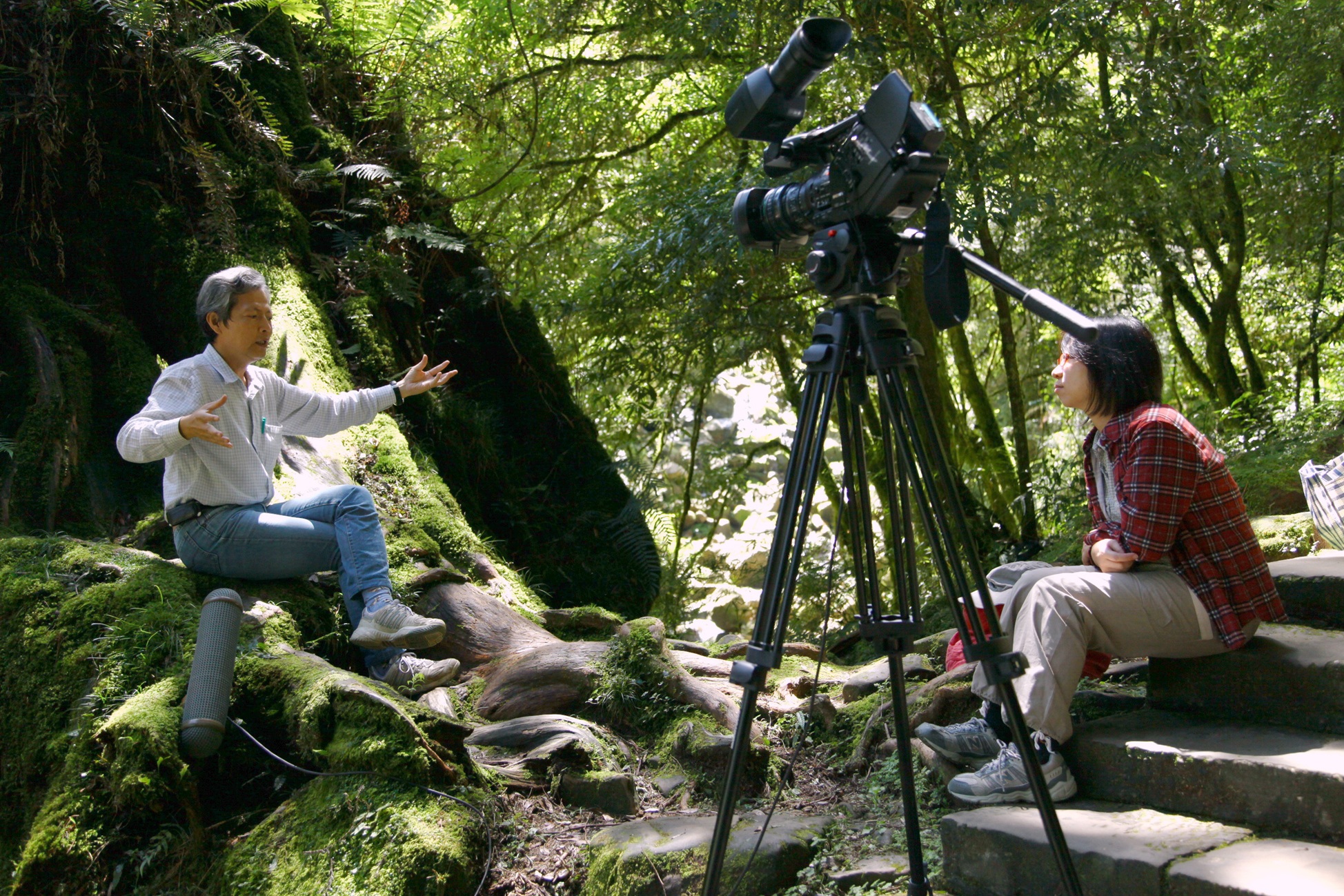 《給親愛的孩子》企圖以更大的環境時間尺度探索世代環境正義議題。圖為黃淑梅導演於阿里山檜木林中訪問生態學者陳玉峯(黃淑梅提供)