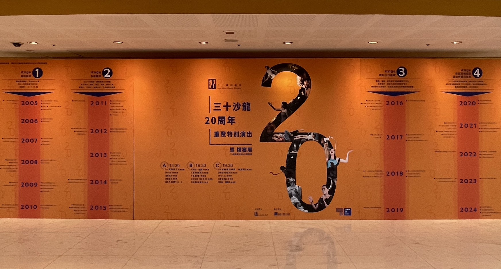 「三十沙龍20周年重聚特別演出」現場展示之主視覺和年表牆。(三十舞蹈劇場提供)