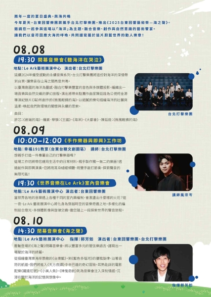本屆藝術祭以「海洋」為主題,由台北打擊樂團的《聽海洋在哭泣》音樂會揭開序幕,帶領觀眾透過聲音展開一場關於環境與海洋的省思旅程。系列活動內容豐富多元,包括探索聲響創作的《手作樂器與即興》工作坊、培育在地學子的《擊樂大師班》、展現跨文化風貌的《世界音樂在 Le Ark》室內音樂會,以及兩團聯合壓軸演出的閉幕音樂會《海之聲》。透過多樣形式的音樂會、工作坊和課程,藝術祭將音樂、創作與自然意識緊密交織,期待在為觀眾帶來一場夏日藝術饗宴的同時,也喚起大眾對海洋保育的關注與情感連結。