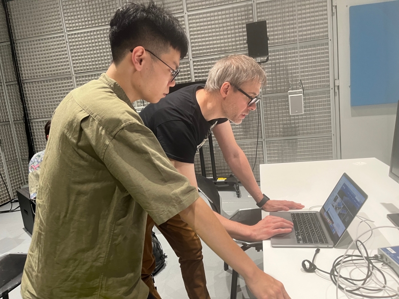 「林劭奇獲選參與 2025 法國聲響與音樂研究統合中心(IRCAM)『ManiFeste - 2025』音樂節並發表作品」:6月17日於IRCAM與技術導師進行個別課程(開放旁聽)(林劭奇為前方著綠衣者)