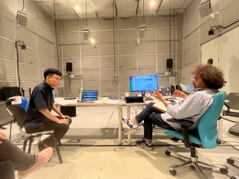 「林劭奇獲選參與 2025 法國聲響與音樂研究統合中心(IRCAM)『ManiFeste - 2025』音樂節並發表作品」:6月18日於IRCAM與作曲導師進行個別課程(開放旁聽)(林劭奇為左方著深藍衣者)