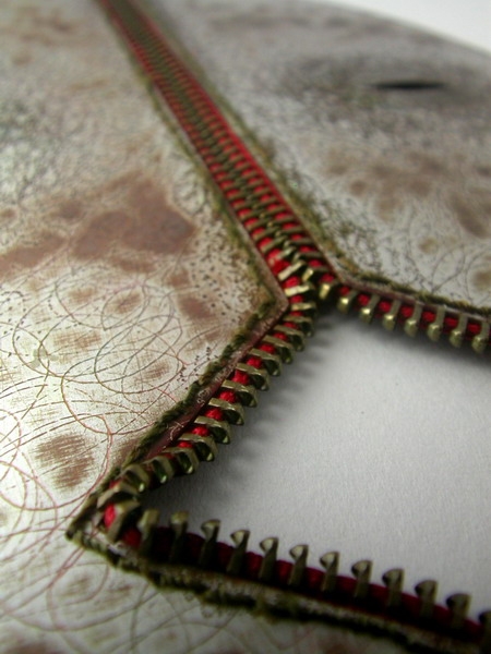 以金屬為創作媒材,除了本身對金屬的偏好,亦可運用鉚接、縫合、冷接等技法與其他媒材結合。這一系列關於互動的作品選擇以鋁為主,特別針對鋁陽極氧化處理創作。鋁陽極氧化處理是最近常運用的金屬工藝技法,一般運用於工業產品表面處理,工業化的處理多是針對表面的硬度與標準化的色彩為基準,其實鋁染色是具有豐富的色彩與繪畫性,可以用不同的手工表現特殊的色彩變化與質地,有別於一般金屬的單一色澤,並還可運用印刷技術結合圖像創作。在表面處理上還有許多部份等待開發,此次系列作品就運用了許多圖像,用製作絹版的方式將油性染劑拓印在表面,然後利用油水分離的特性製造特殊的色彩,或是利用不同階段的陽極處理,其顏色是一般繪畫或是工業上的金屬印刷難以呈現。除了色彩,質感上也以粗帆布或是厚紙版輾壓出纖維質地,除卻原本金屬光滑的肌理,看上去接近一種硬挺的紙張或布料。