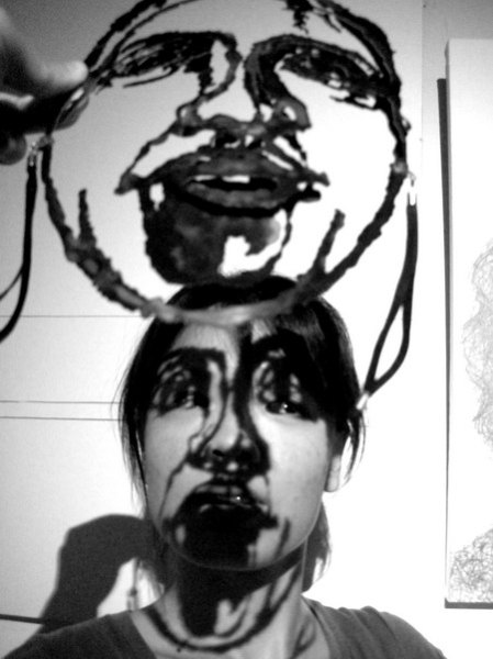 此次的作品多是佩帶在臉上的面具,每一種樣式都露出佩帶者部分的臉,在這不全然遮蔽的作品裡,我們可以若影若現的觀察,人的表情與實際的物件兩者進行了面容的嵌合,包含了與金屬接觸的恐懼或是與皮膚之間不服貼的擠壓觸覺。這些觸覺在臉部是放大,而佩帶在臉上時物件的個性也會因面具之下人臉表情而改變,面具有趣的是會引誘人表演,反而超越物件的樣子。不同人佩帶有不同的個性,在兩人同時佩帶時還可以彼此言笑,反而產生出屬於他們自己的故事情節。