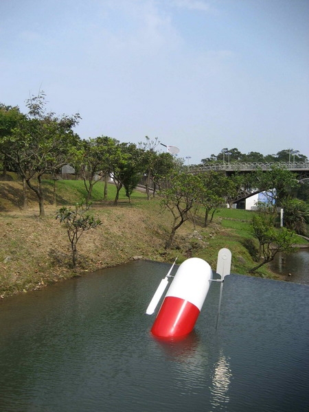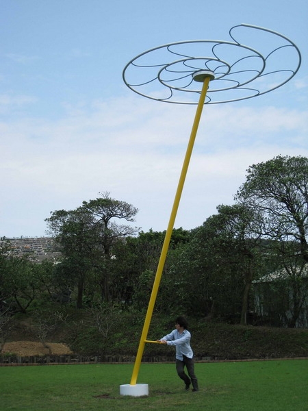 這些蘊藏太極智慧的作品,抽取自日常生活的物象造型,以現代社會習見的鋼鐵等工業材料製成,裝置在美術館園區內,順應風吹、水流種種天地氣息,進行曼妙運轉,呈顯大自然的存在,體現理想中「天、地、人三位一體的至高幸福」。