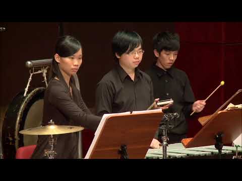 李英老師指揮其作品「易之隨想」,樂曲共分為渾沌、獵、現象丶太極四段,以許多特殊聲響表現出原始洪荒中各種動物丶人聲、大自然之間的互動。