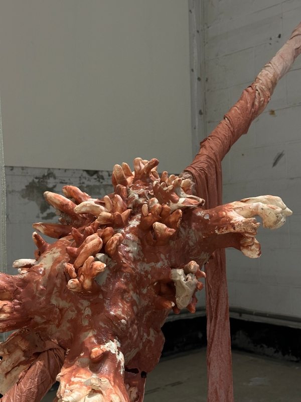 在材料操作上,我使用了燒製以及未燒製的陶土、石膏、矽膠、金屬支架、布料織品與水管等材料,結合石膏手部動作翻模與即興拼貼構築骨架,表現內外張力與時間性變化。裝置於展場中隨環境條件產生變形的回應,使雕塑成為一種反應環境、身體與結構交疊關係的裝置。創作不再僅是對物件的控制,而是一場關於不穩定性、支撐性與渲洩邊界的展演過程。