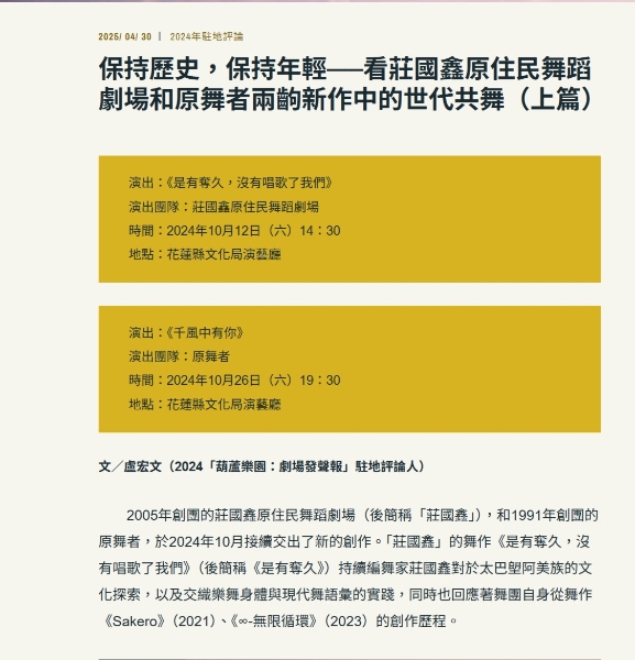 邀請長期身在花蓮參與並且觀察劇場演出評論人盧宏文,居住桃園地區資深兒童劇場評論人謝鴻文,近年「葫蘆樂園」劇評工作坊學員沈亮慧(台中駐地),延續近年工作坊能量。以及,工作坊成員許映琪以其自身視障者的觀點,對臺灣當代劇場生態與美學發展提供不同視角的觀照,共同豐富在地藝文展演觀察記錄資料庫。