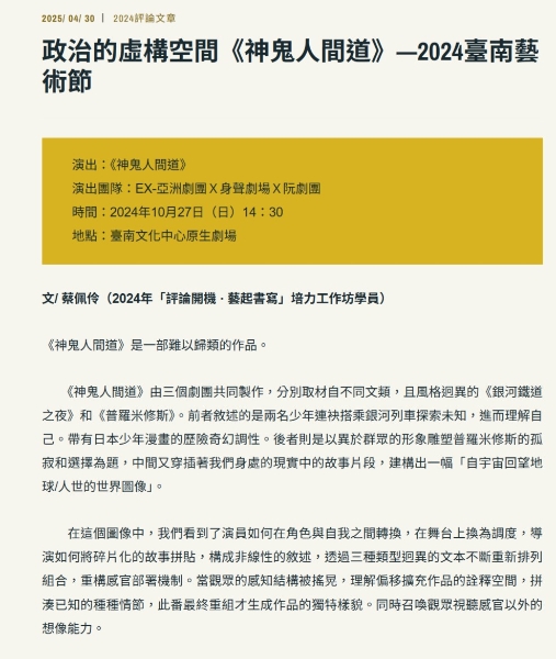 「藝起有力」 南臺灣藝評與觀演交流平台 一「葫蘆樂園:劇場發聲報」 2024年度營運暨推廣計畫