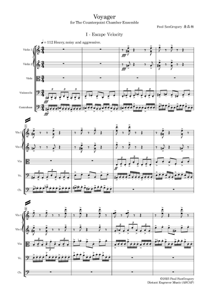 桑磊柏(Paul SanGregory)為對位室內樂團特別創作的《航海者》(Voyagers),是一首為弦樂五重奏而作的全新委託作品,靈感來自NASA於1977年發射、至今仍航行於深空的兩艘「航海者」探測器。這些無人探測器承載著人類對宇宙的渴望與探索精神,曾近距離觀測木星、土星等遙遠行星,並利用「飛掠」方式加速航向更遠的星際,如今早已遠離太陽的影響範圍,卻依然傳回微弱訊號,持續向神秘的深邃太空前進。