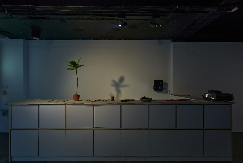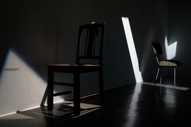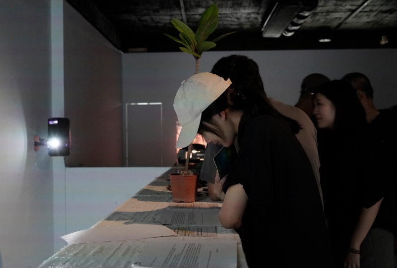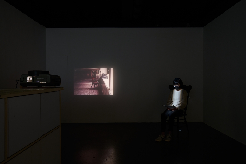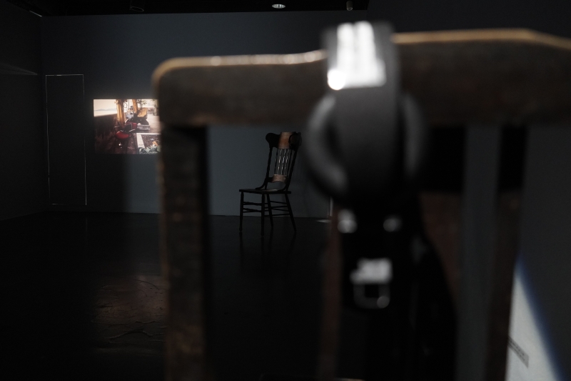 海馬迴藝工隊主辦聯展「接觸.地帶 Contact Zoning」展場圖片:葉奕蕾的裝置作品《和椅子一起聆聽》探討感官如何作為觸發記憶的因素,使用聲音、文字、物件、氣味、幻燈片等媒材,追溯其藝術生涯和從小至今遊牧於東南亞各城市的生命旅程