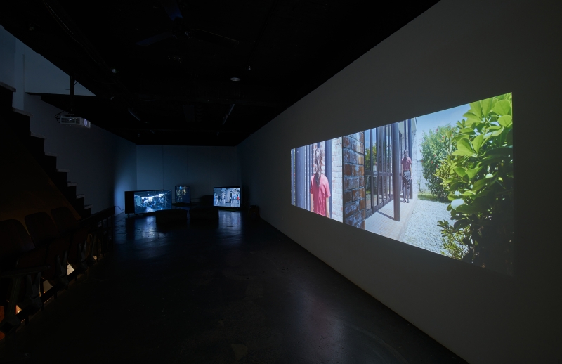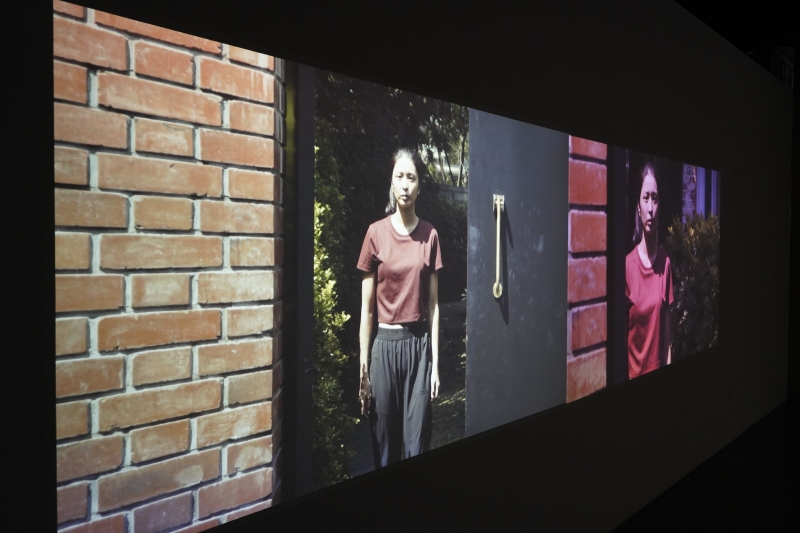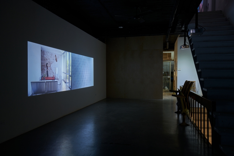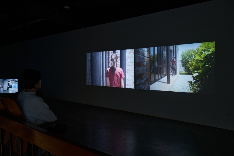 海馬迴藝工隊主辦聯展「接觸.地帶 Contact Zoning」展場圖片:二樓展場前段為台灣藝術家丘智華的作品《每個動作都是一個未曾說出的字詞》,雙頻道同步投影拍攝舞者在建築空間以身體運動展開一系列的身體宣示