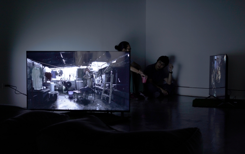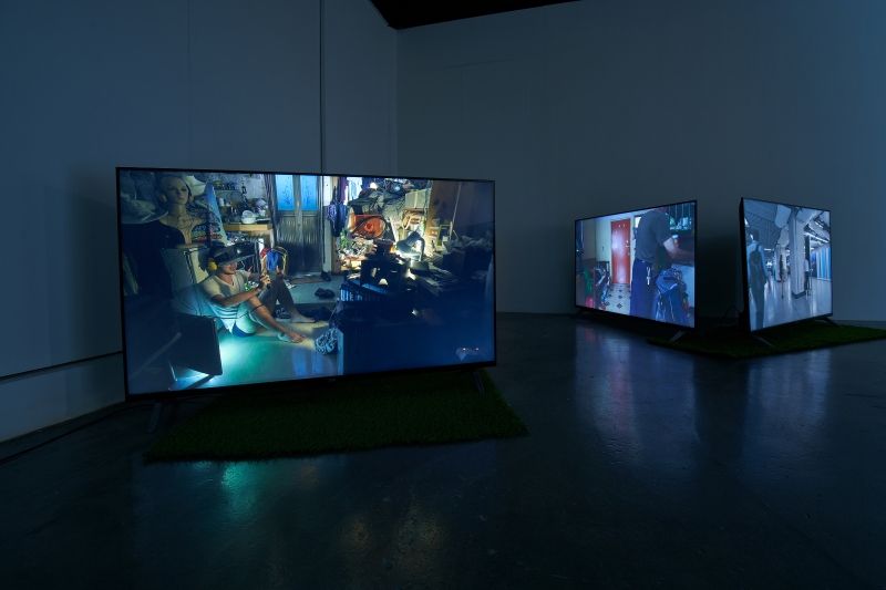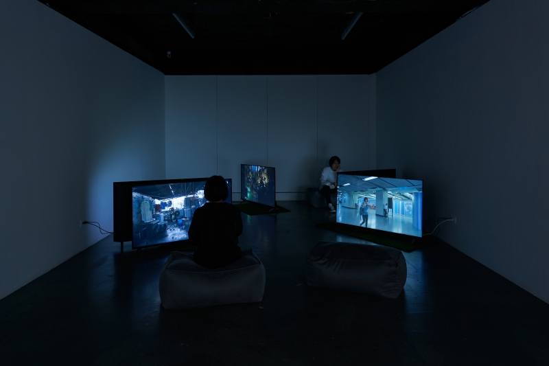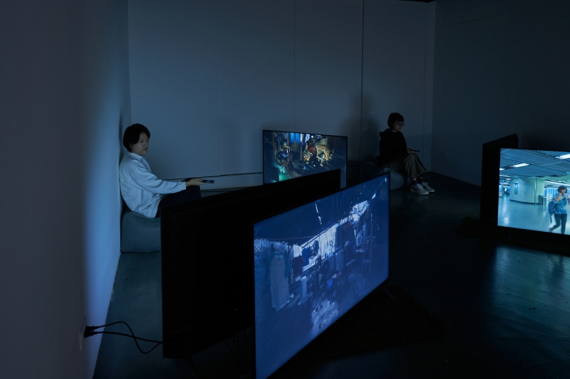 海馬迴藝工隊主辦聯展「接觸.地帶 Contact Zoning」展場圖片:《無調人間》(2021)將28分鐘的實驗短片轉化成五組不同場景的影片,觀眾可以使用遙控器轉台、遊走於五台電視之間,突破觀影的線性敘事