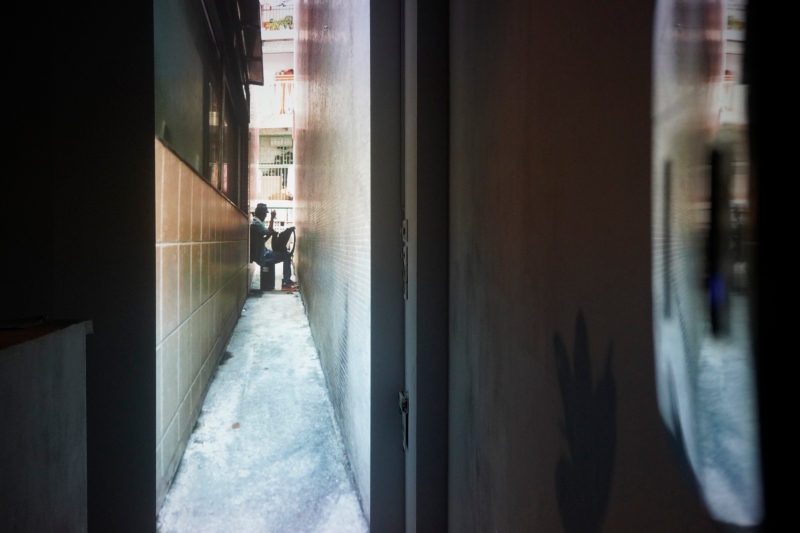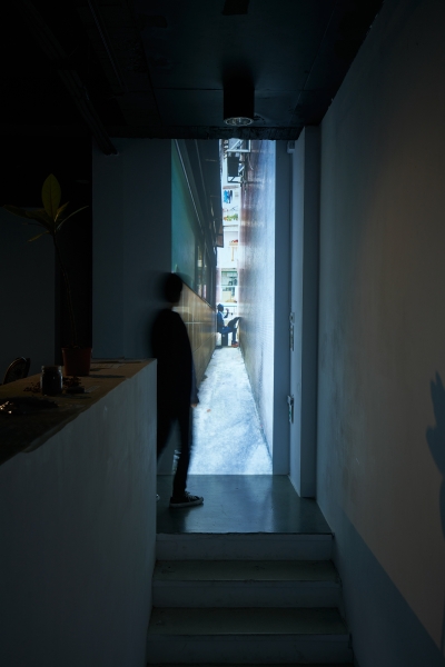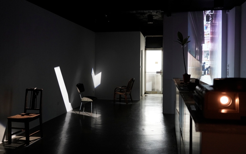 海馬迴藝工隊主辦聯展「接觸.地帶 Contact Zoning」展場圖片:三樓展出劉景愉的《魚網里》與葉奕蕾的《和椅子一起聆聽》,都是為本次展覽的全新製作。《魚網里》以一條73公分寬的窄巷作為城市中的「舞台」,邀請城市中不同身份的居民在窄巷中展演