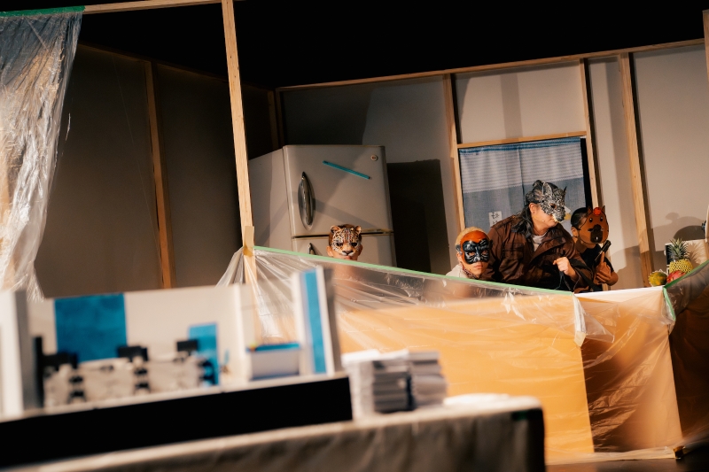 在一間約莫二十五坪大的簡陋房子裡,客廳的正中央放置著一個精美的紙房子,那是台北某銀行的微縮模型。臉上戴著動物面具的四個人煞有其事地推敲著一場驚天動地的大搶案。