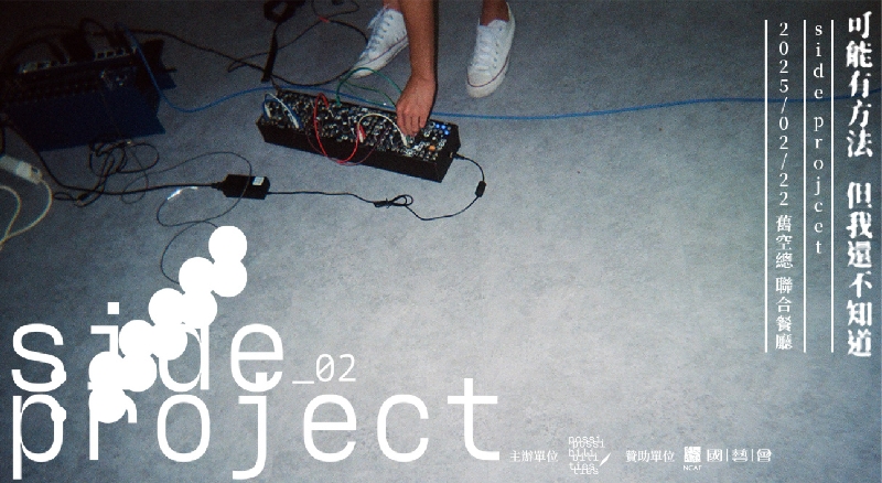 相隔一年,「side project」繼續於 2025年2月22日再啟,選定台北東區舊空總(C-LAB)聯合餐廳舉行。02 主題定名為「可能有方法 : ) 但我還不知道 : / 」,是對創作的持續探問與行動。參與「side project」02 演出的音樂人包括:以EP《奶汁》獲第十四屆金音獎最佳電音歌曲的 Sophie Lu+噪音印製、台灣後搖滾代表人物昆蟲白+鼓手光,以及參演01時造成深水炸彈般迴響的實驗電聲&爵士鼓手林偉中,搭配人聲即興歌手AnGuHu。